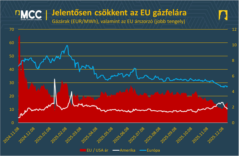 A globális LNG-piac pedig összekötötte a két történetet. Rengeteg új kapacitás érkezett, főleg az Egyesült Államokból. És a rugalmas szállítmányok olyanok, mint a jó pincérek: oda mennek, ahol nagyobb szükség van rájuk. Amikor Ázsia épp kevésbé vásárol, akkor Európa nyer alkupozíciót, és tud kisebb áron beszerezni.