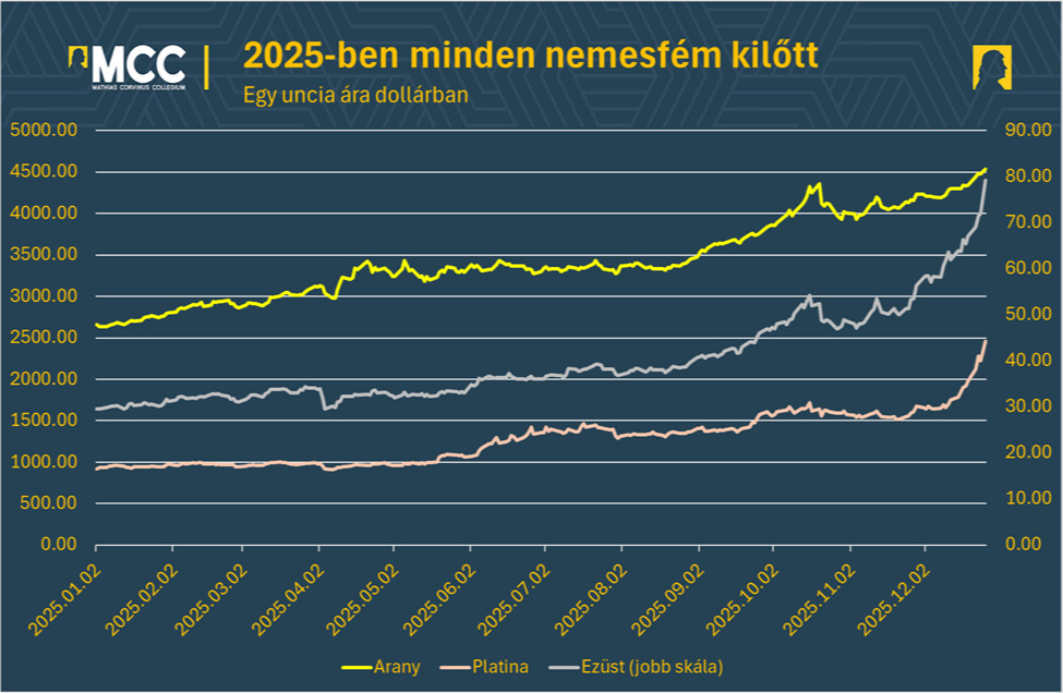 Fontos látni a kontrasztot a korábbi évekkel. 2021-ben mindhárom fém szenvedett, 2022-ben a platina előre szaladt, 2023-ban az arany tette ugyanezt, 2024-ben az arany és az ezüst is nagyot futott. De 2025-ben végre a teljes történet összeért, és az év a nemesfémek éve lett.