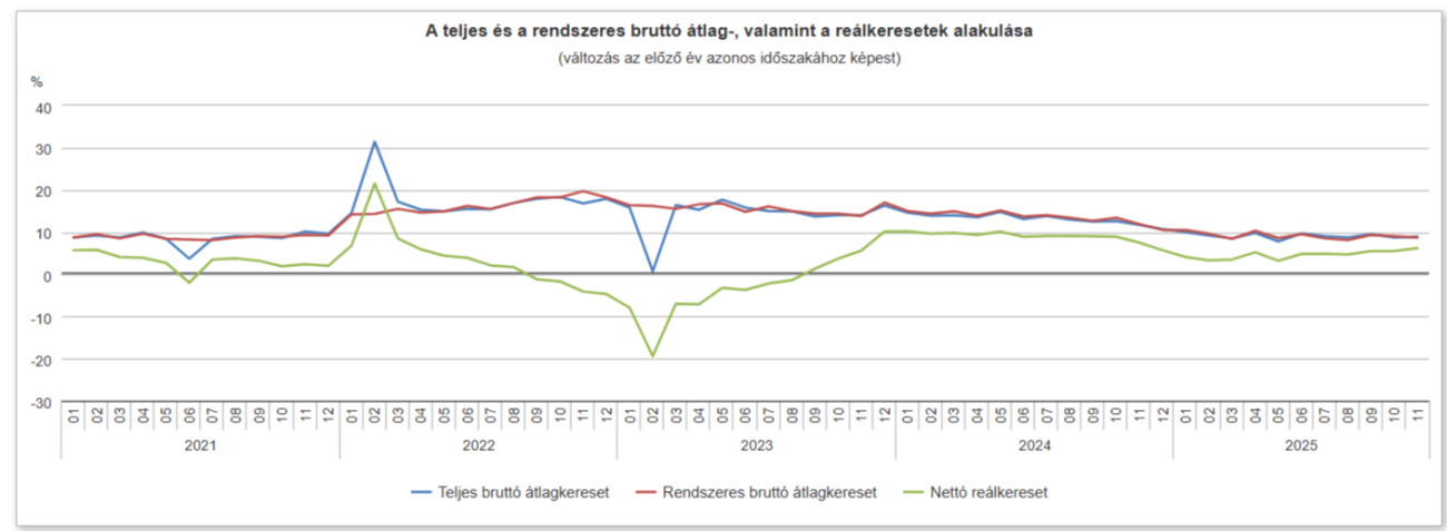 2025. novemberében a rendszeres (prémium, jutalom, egyhavi különjuttatás nélküli) bruttó átlagkereset 665 100 forint volt, ami 8,7 százalékkal több, mint az előző év azonos időszakában. A rendszeres bruttó átlagkereset a vállalkozásoknál 653 100, a költségvetésben 679 100, a nonprofit szektorban 739 500 forintot tett ki, 7,5 és 10,4, illetve 14,4 százalékkal nőtt egy év alatt.