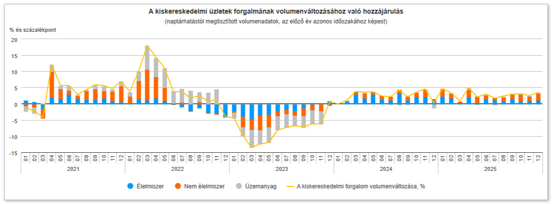 2025-ben kiskereskedelem forgalmának volumene 2,9 százalékkal bővült naptárhatástól megtisztítva az előző évhez képest. Az élelmiszer- és élelmiszer jellegű vegyes kiskereskedelemben 2,5, a nem élelmiszer-kiskereskedelemben 4,4, az üzemanyag-kiskereskedelemben 0,8 százalékkal nőtt az értékesítés volumene – közölte a KSH.