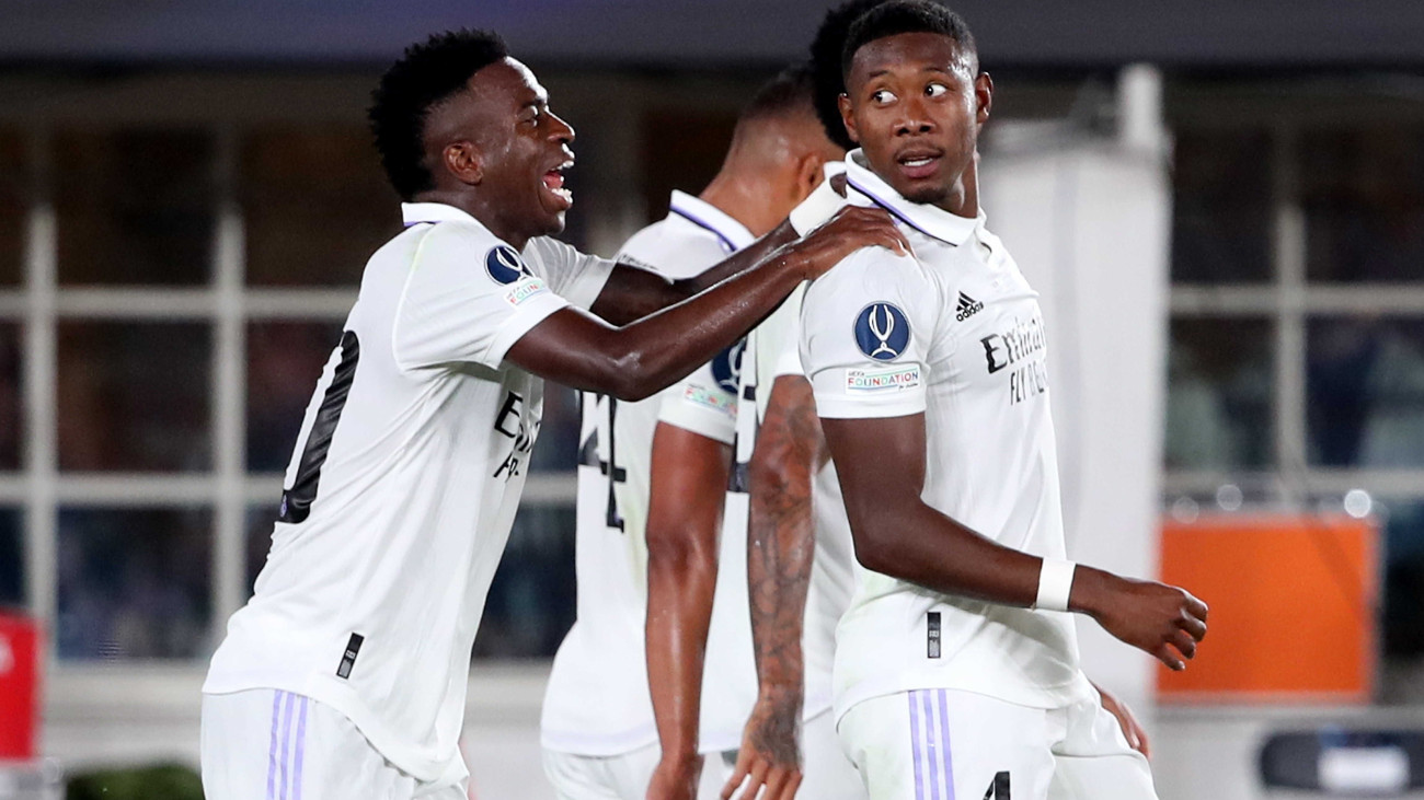 David Alaba, a Real Madrid játékosa (j), miután megszerezte a találkozó első gólját a labdarúgó Európai Szuperkupa Real Madrid-Eintracht Frankfurt mérkőzésén a helsinki Olimpiai Stadionban 2022. augusztus 10-én.