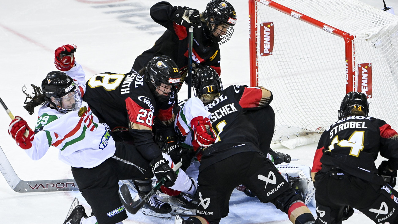 (A nyitóképen: Kreisz Emma (balra), valamint a német Katarina Jobst-Smith, Laura Kluge, Nicola Hadraschek és Carina Strobel a női jégkorong olimpiai selejtezőtorna harmadik fordulójában játszott Németország–Magyarország mérkőzésen a bremerhaveni Eisarenában, 2025. február 9-én.)