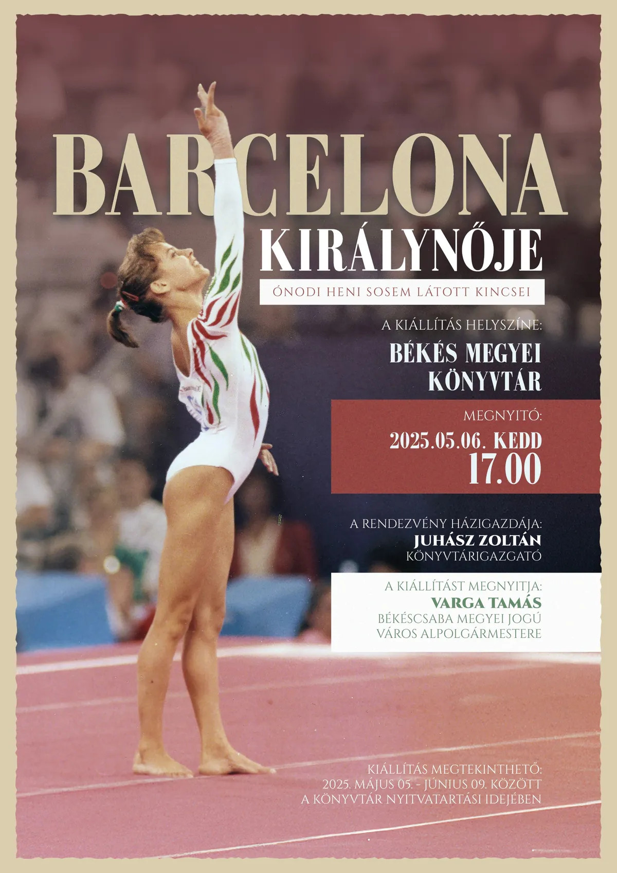 A "Barcelona királynője - Ónodi Heni ismeretlen kincsei" című kiállítást Varga Tamás alpolgármester nyitja meg a Magyar Sport Napján 17:00-kor a Békés vármegyei könyvtárban.